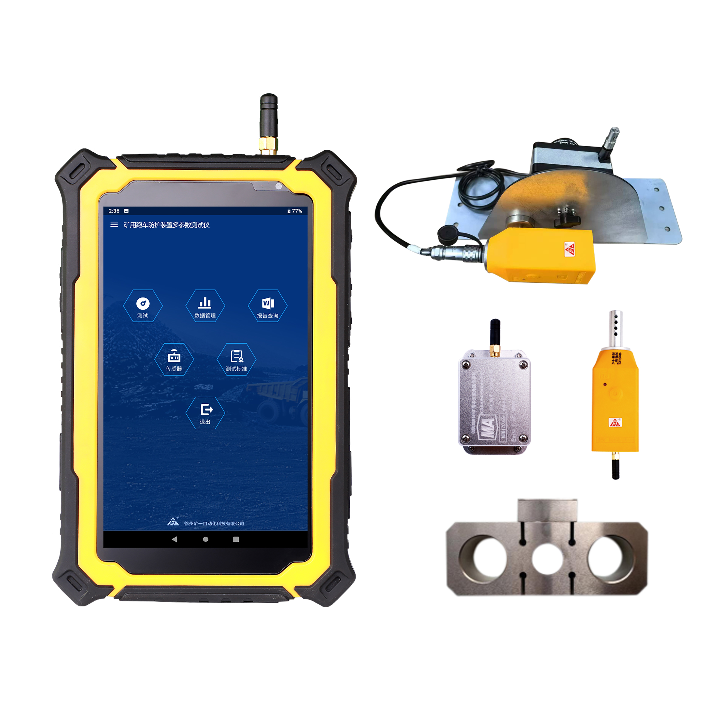 儀器用于礦用跑車防護裝置的性能檢測,可測試最大收放力、提升速度、斜坡軌道角度、距離、環境參數、車輛質量、噪聲,可以計算抗沖擊能量試驗的斜坡長度等。